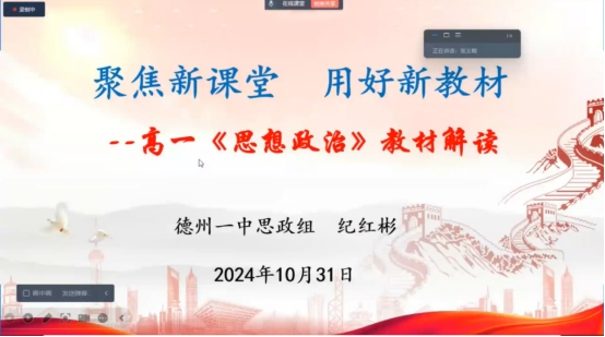 为深入贯彻落实习近平总书记关于教育的重要论述,扎实推进大中小思政课一体化建设,10月31日,亚博取款出账秒到在黄河流域大思政课虚拟教研室平台举办了“聚焦新课堂 用好新教材”系列讲座的首场活动。此次活动特别邀请德州第一中学教学能手、齐鲁名师纪红彬,对高一《思想政治》教材进行了深入解读,吸引了众多思政课教师和思想政治教育(师范)专业学生参与。